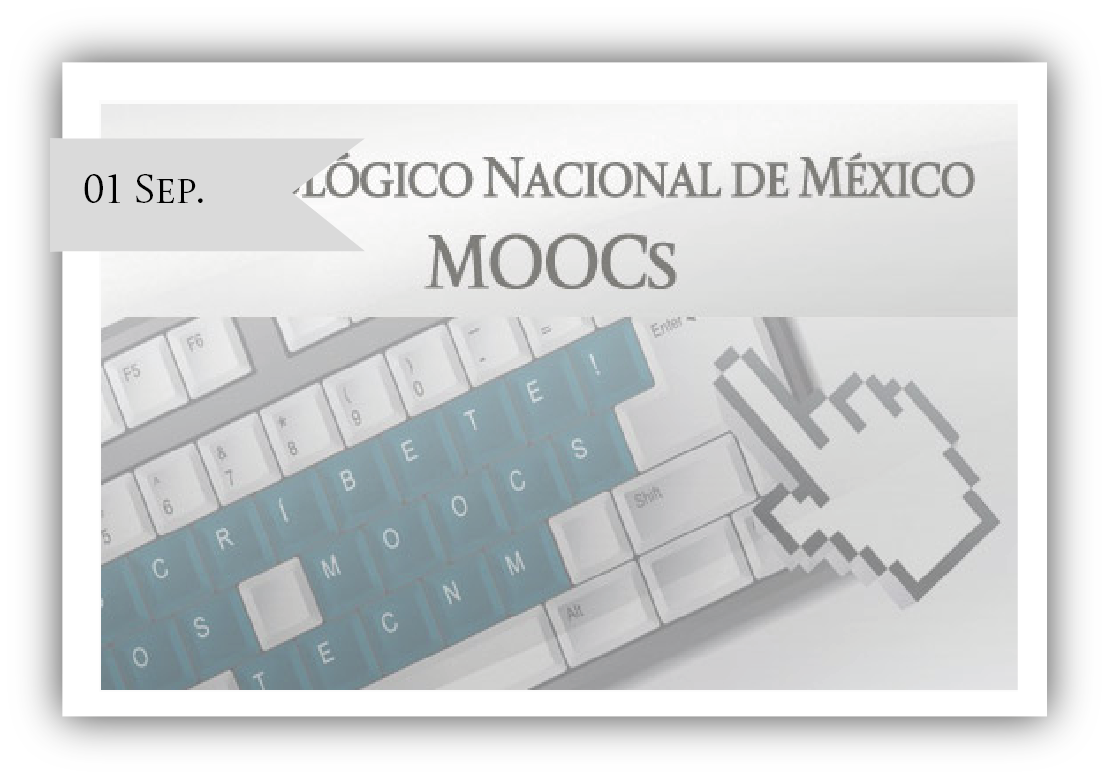 El Tecnológico Nacional de México (TecNM) iniciará en septiembre 9 cursos de la modalidad MOOC (Cursos Abiertos, Masivos y en Línea) en la plataforma México X, como parte de la Estrategia Nacional Digital de la Presidencia de la República y coordinado por la Dirección General de Televisión Educativa (DGTVE) de la Secretaria de Educación Pública.